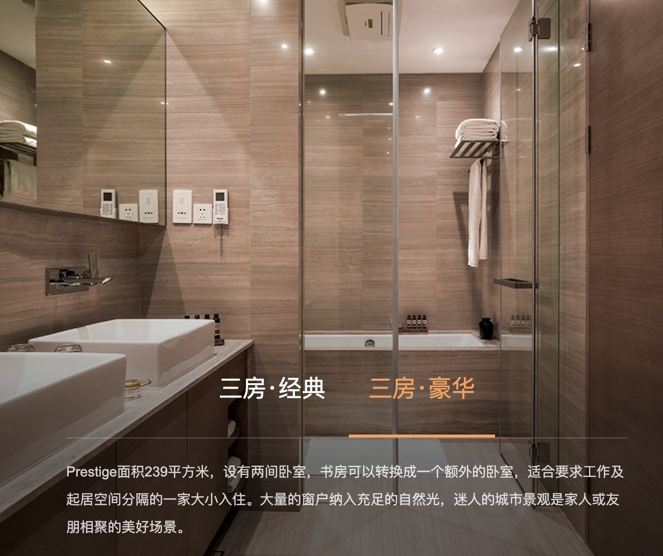 • 三居室(239㎡):接近一套完整的市中心大平层,同时保留酒店式管理与服务体系