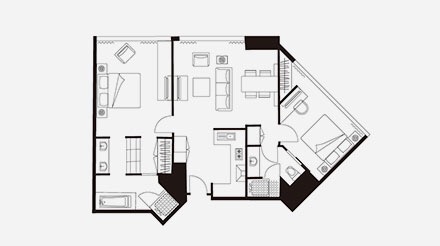 贵宾两居室公寓的面积为 155-179 平方米,设计精美,集豪华与便利于一体,公寓内采用现代化装饰风格,设有两个豪华且宽敞的卧室、两个独立卫浴、一个装饰时尚的起居区和一个设施齐全的小厨房,非常适合一起出差的几位商务伙伴或四人家庭入住。