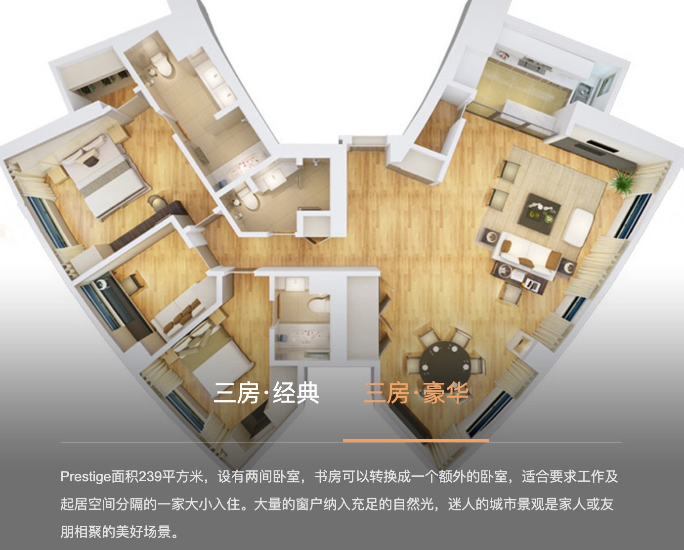 • 三居室(239㎡):接近一套完整的市中心大平层,同时保留酒店式管理与服务体系
