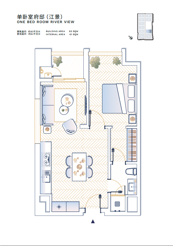 • 一房|约83-87㎡:明确的起居与休息分区,更适合希望“住得像家”的长期单人或情侣住客。空间尺度舒适,功能划分清晰。