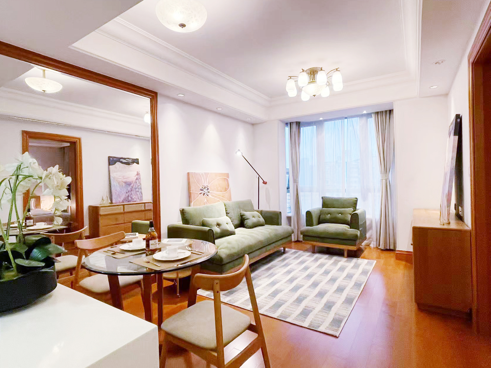 公寓内部设计以经典风格为主,空间布局实用,客厅、餐厅与卧室分区明确。对于需要大面积居住空间的家庭型租客来说,这类户型在徐汇区服务式公寓市场中具有一定优势。